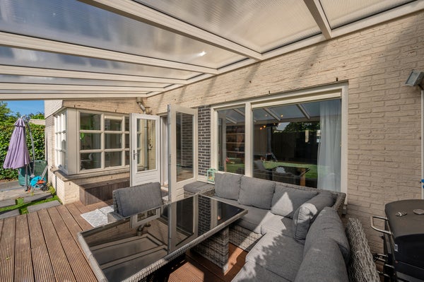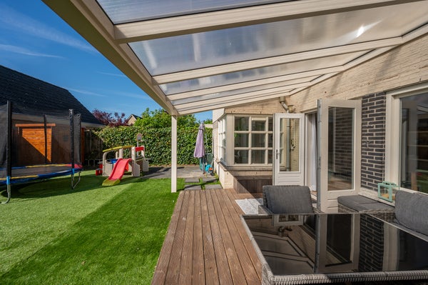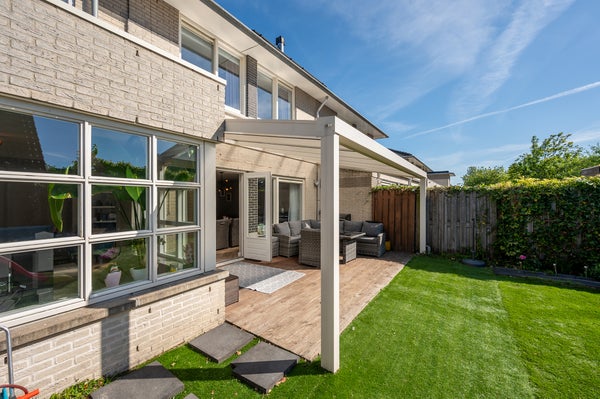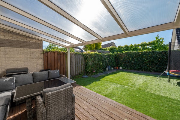 De achtertuin is gunstig gelegen op het zuidoosten en is onderhoudsvriendelijk ingericht met een combinatie van bestrating en kunstgras. De aanwezige overkapping maakt het mogelijk om in alle seizoenen comfortabel van het buitenleven te genieten.