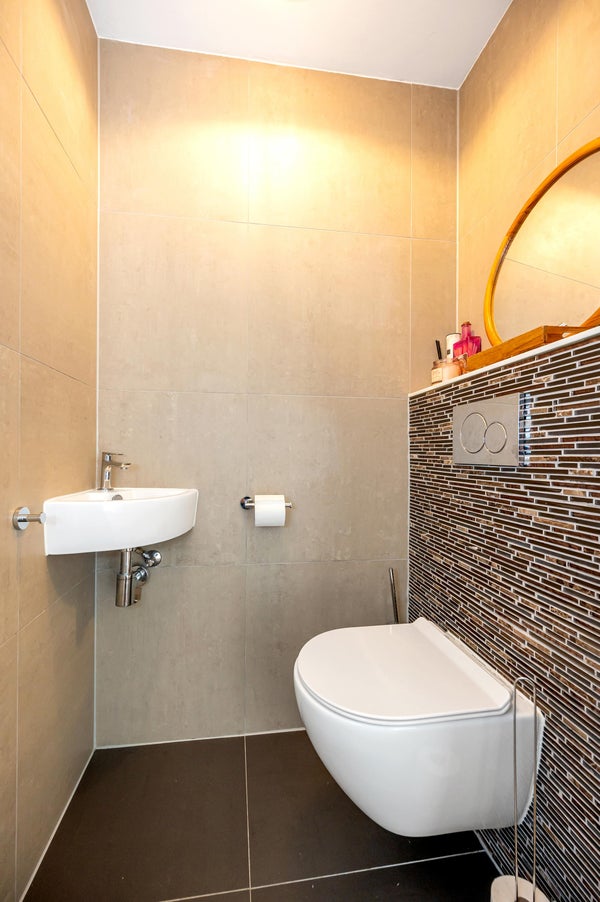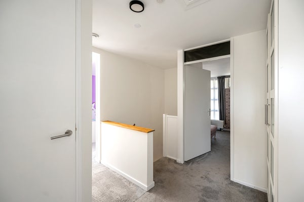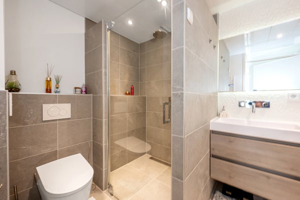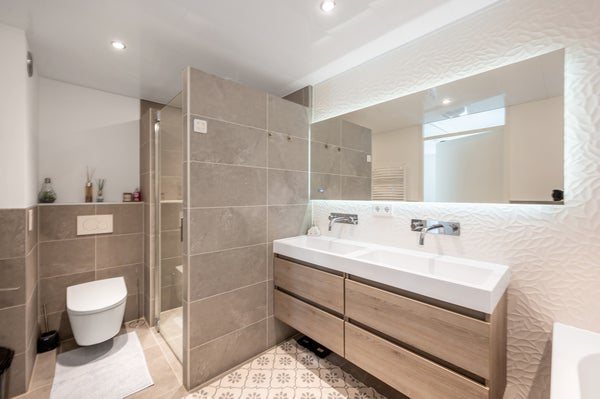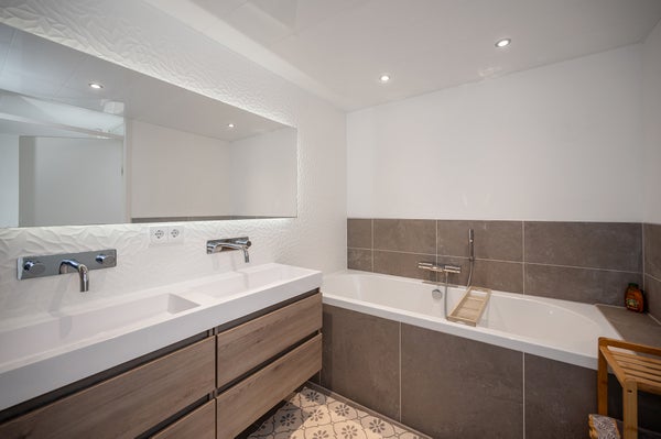Deze is voorzien van een dubbel wastafelmeubel, een brede verlichte spiegel, een tweede toilet, een designradiator, een ligbad en een royale inloopdouche met stortdouche en glazen wand. De gehele verdieping is afgewerkt met vloerbedekking, wat zorgt voor een warme en rustige uitstraling.