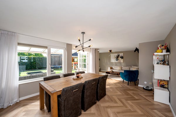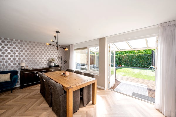 De woning verwelkomt u via een verzorgde entree met toegang tot de meterkast, een praktische trapkast, een modern uitgevoerde toiletruimte met fonteintje en de trap naar de eerste verdieping. Aan de voorzijde bevindt zich een veelzijdige ruimte die zich uitstekend leent voor gebruik als werk-, studie- of hobbykamer, maar ook als gastenverblijf voor bijvoorbeeld (groot)ouders. Vanuit de hal bereikt u de royale woonkamer, waar grote raampartijen en openslaande deuren naar de tuin zorgen voor een aangename lichtinval. De keuken is eveneens aan de voorzijde gesitueerd en uitgevoerd met een eigentijds kookeiland en een duurzaam granieten werkblad. De keuken is compleet uitgerust met hoogwaardige inbouwapparatuur, waaronder een inductiekookplaat met geïntegreerde afzuiging, oven, magnetron, vaatwasser, Quooker en een koel-vriescombinatie.