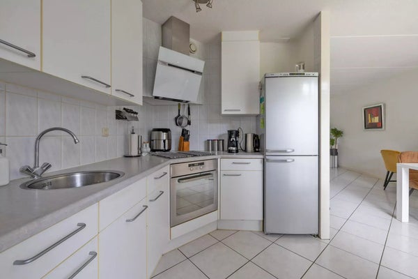 Aan de achterzijde bevindt zich de open keuken, uitgerust met een keramische kookplaat, afzuigkap, oven en koelkast. De vaatwasser bevindt zich in de aangrenzende bijkeuken, die ook dienstdoet als wasruimte. Aansluitend vind je een multifunctionele praktijkruimte (voormalige garage) met eigen ingang, elektra én een wastafel met warm en koud water – ideaal als werkplek aan huis, hobbyruimte of extra opslag.
