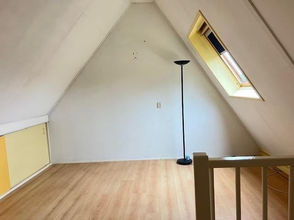 De zolderverdieping is bereikbaar via een vaste trap en biedt een ruime zolderkamer met extra opbergruimte achter de knieschotten – perfect als logeerkamer, thuiskantoor of speelruimte.