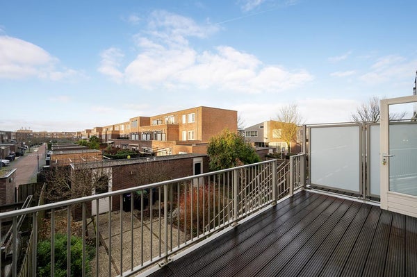 De achtertuin ligt op het zonnige zuidwesten, grotendeels bestraat en is voorzien van een stenen berging. Boven de achtertuin bevindt zich het tweede balkon, dat toegankelijk is via de eerste verdieping en via een buitentrap in de achtertuin.
