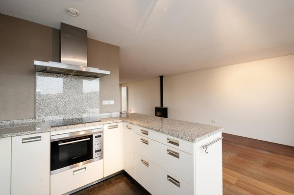 Via de trapopgang komt u op de overloop, die toegang biedt tot de ruime en lichte woonkamer. Aan de voorzijde van de woonkamer bevindt zich een schuifpui die toegang geeft tot de loggia, waar u kunt genieten van een vrij uitzicht. Aan de achterzijde grenst de eetkamer aan de luxe open keuken en biedt toegang tot het tweede balkon. De keuken is modern en beschikt over veel kastruimte, een koel- en vriescombinatie, een vaatwasser, een inbouw oven/magnetron, een inductiekookplaat en een afzuigkap.