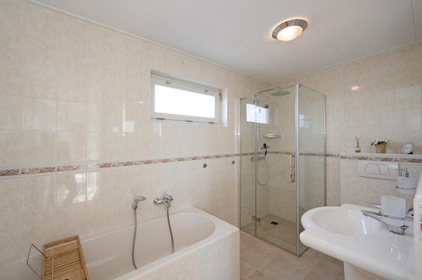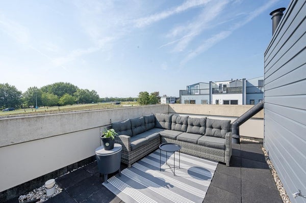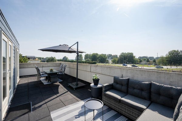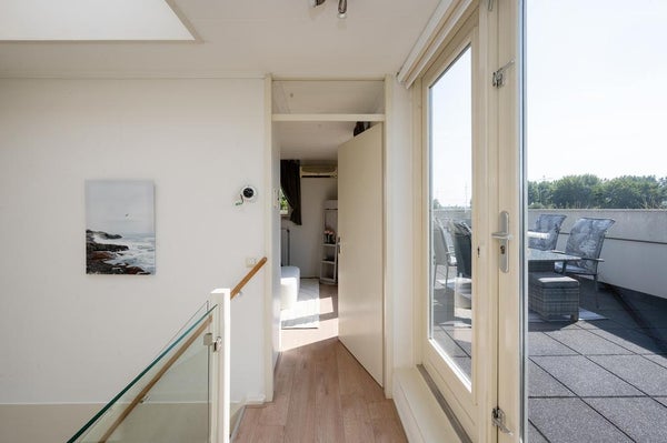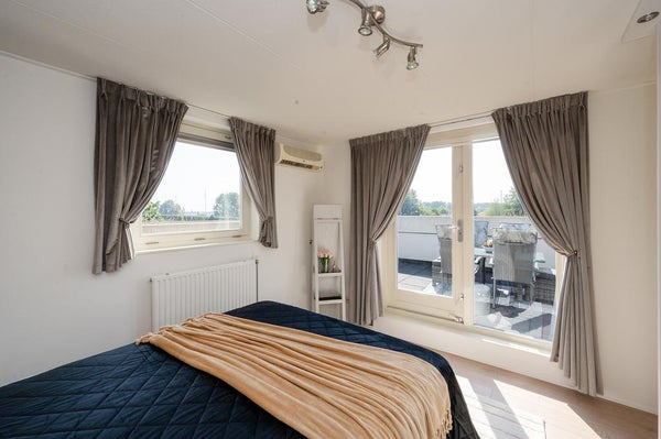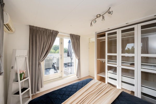 Op de tweede verdieping bevindt zich een lichte overloop, goed verlicht door een lichtkoepel boven de trap en openslaande deuren. Daarnaast vindt u op deze verdieping een technische ruimte met aansluitingen voor wasmachine en droger, en de opstelling van de cv-ketel. Verder is er een ruime slaapkamer met airconditioning en een grote inbouwkast. De badkamer is voorzien van een ligbad, een inloopdouche met regendouche, een wastafel en een toilet. Op deze verdieping bevindt zich tevens een ruim dakterras van 44,5 m². Het terras biedt een vrij uitzicht en is een uitstekende plek om te ontspannen.