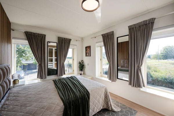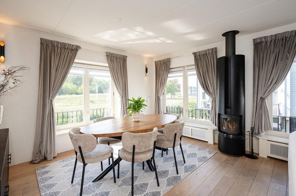 Op de eerste verdieping bevindt zich de woonruimte met een ruime woonkamer, die dankzij grote raampartijen een prachtig uitzicht biedt over het water. Deze ramen kunnen volledig worden geopend, waardoor de ruimte extra licht en open aanvoelt. De woonkamer is afgewerkt met een massieve eikenhouten vloer en uitgerust met een houtkachel, die zowel voor warmte als een aangename sfeer zorgt. Aan de voorzijde van de woning bevindt zich een ruime eetkeuken, praktisch ingericht met een halfronde opstelling. De keuken is voorzien van alle benodigde apparatuur, waaronder een inductiekookplaat, afzuigkap, vaatwasser, combi-oven, ladekoelkast en een aparte vriezer. Vanuit de tussenhal heeft u toegang tot een ruim toilet met wastafel en een royale slaapkamer, welke is afgewerkt met een grindvloer.