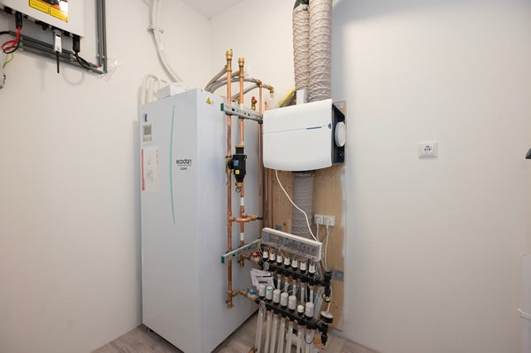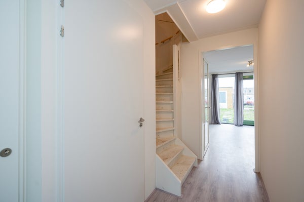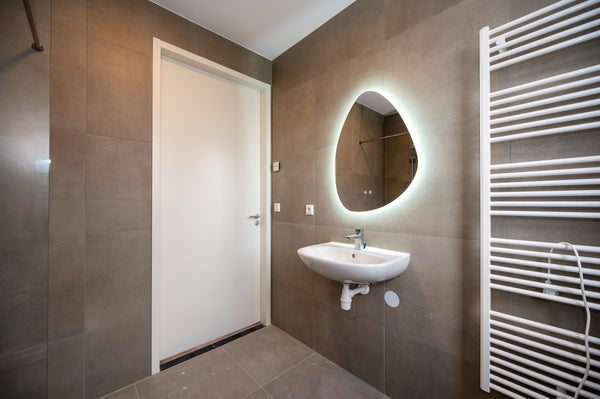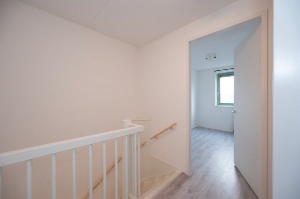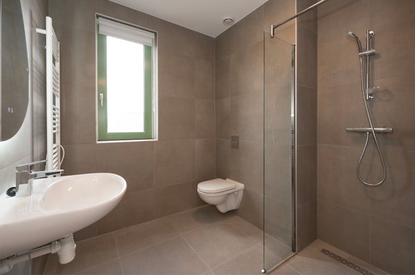 De overloop geeft toegang tot drie slaapkamers, waarvan één aan de voorzijde en twee aan de achterzijde van de woning. De moderne badkamer is voorzien van een wastafel, toilet en een royale douche en biedt alle comfort voor dagelijks gebruik. Tevens bevindt zich op deze verdieping een praktische technische ruimte met aansluitingen voor de wasmachine en ruimte voor installaties.