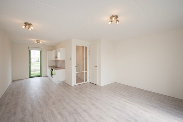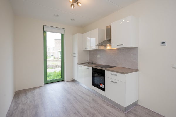 Via de entree kom je in de hal met meterkast en een modern toilet. Vanuit hier bereik je zowel de trap naar de eerste verdieping als de sfeervolle woonkamer. De open keuken aan de voorzijde van de woning is compleet uitgerust met diverse inbouwapparatuur, waaronder een inductiekookplaat, afzuigkap, vaatwasser, koel-vriescombinatie en oven, en biedt ruime opbergmogelijkheden. De tuingerichte woonkamer is licht en ruim opgezet. Dankzij de brede schuifpui loopt de woonruimte naadloos over in de zonnige achtertuin, waardoor binnen en buiten mooi met elkaar verbonden zijn.