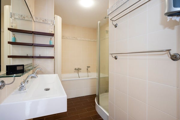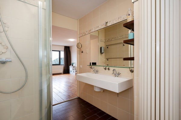 Tevens bevindt zich hier ook de eerste badkamer met dubbele wastafel, douche, ligbad en een separate toilet.