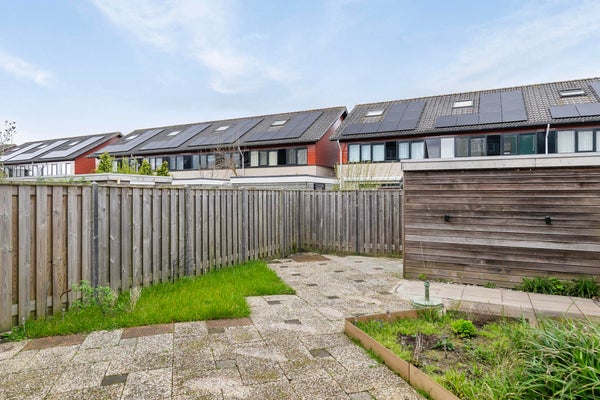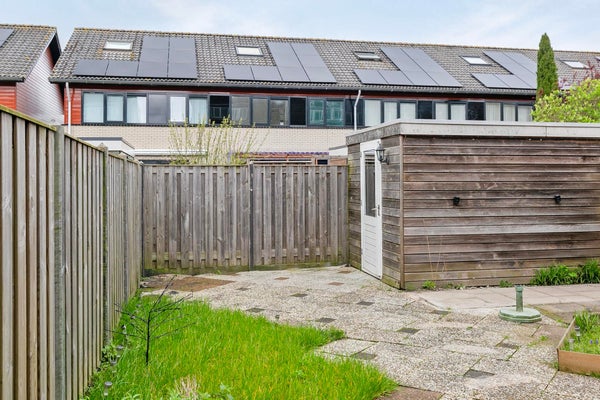 De fijne achtertuin is ongeveer 12 meter diep en gelegen op het noordwesten. Door deze ligging heb je bijna de hele middag zon tot in de laatste uurtjes van de dag. Achter in de tuin staat een houten berging. Aan de zijkant van de tuin is een poort. Ook is er aan de zijkant van het huis een extra fietsenberging.