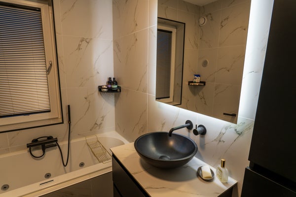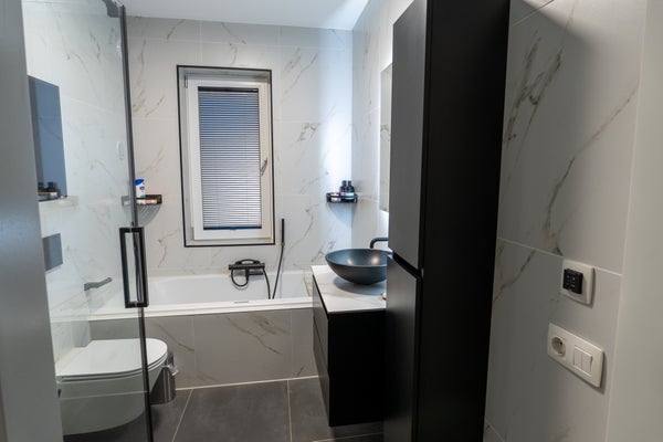 Vanuit de woonkamer bereikt u via de trap de eerste verdieping. De overloop biedt toegang tot drie kamers, waarvan twee grote slaapkamers en één werkkamer met bureau en monitor en een luxe badkamer. De badkamer is tot aan het plafond betegeld en uitgerust met een bubbelbad, een ruime douche, een tweede toilet, en een wastafelmeubel met spiegel.