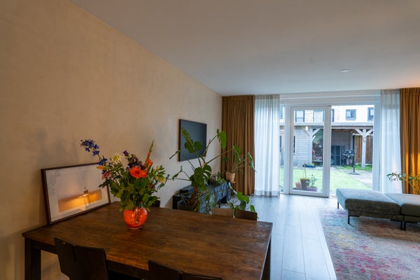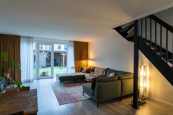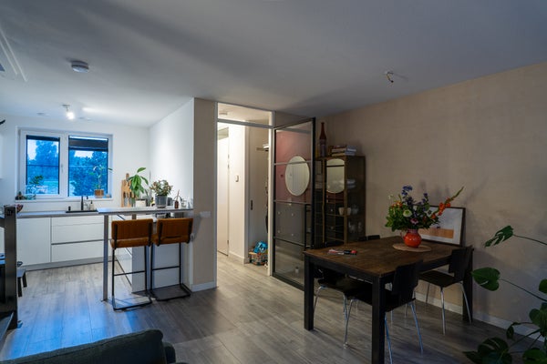 Via de entree met meterkast en modern toilet met fonteintje betreedt u de woning. Een stijlvolle zwarte stalen deur geeft toegang tot de ruime, lichte woonkamer aan de achterzijde. De woonkamer is voorzien van een moderne laminaatvloer met vloerverwarming en beschikt over openslaande deuren naar de brede achtertuin. Aan de voorzijde bevindt zich de moderne open keuken in L-opstelling, uitgerust met diverse inbouwapparatuur en een bar aan de woonkamerzijde.
