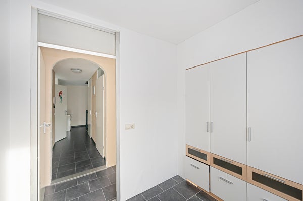 U betreedt de woning de hal, die direct toegang geeft tot de eerste woonruimte en de meterkast. Deze kamer is volledig vrij in te richten, u kunt zelf bepalen hoe u de ruimte gebruikt. Denk bijvoorbeeld aan een gezellige zithoek, een werk- of studeerruimte. In deze ruimte vindt u tevens de trap naar de eerste verdieping. Parallel aan deze kmer bevindt zich een praktische berging, ideaal voor het opbergen van spullen.