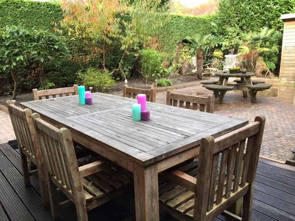 Er is een apart terras aangelegd midden in te tuin, fraai tegelwerk en twee ruime bergingen voor opslag.