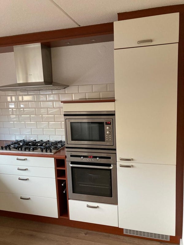 De keuken bevindt zich aan de voorzijde van de woning en is voorzien van een luxe inbouwkeuken in L-vorm met: vaatwasser, close-in boiler, afzuigkap, 6-pits gaskookplaat, heteluchtoven, combi-magnetron, koel/vries combinatie.