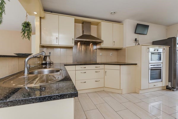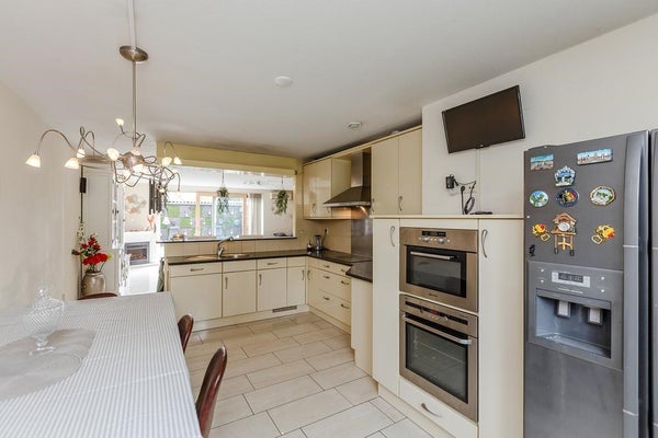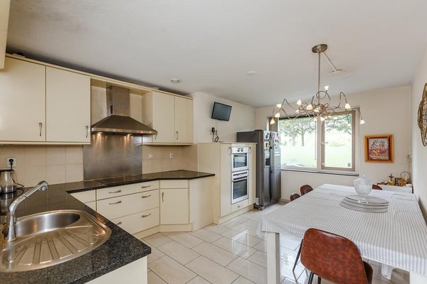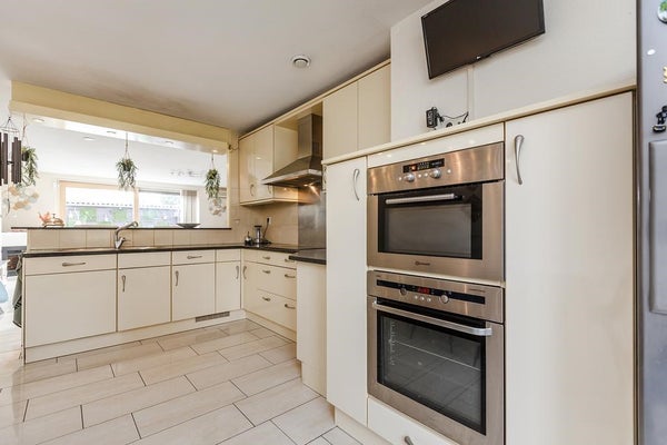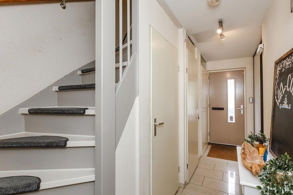 Entree met meterkast, trapkast, trapopgang en toegang tot de woonkamer met open keuken. De ruime en lichte woonkamer is voorzien van een lichte tegelvloer met vloerverwarming en een grote schuifpui naar de achtertuin. De moderne keuken is uitgerust met een vaatwasser, Amerikaanse koel-vriescombinatie, inductiekookplaat, combimagnetron, aparte oven en veel kastruimte.
