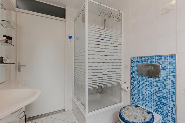 Overloop met toegang tot drie goed bemeten slaapkamers en de badkamer. De gehele verdieping is afgewerkt met een marmerlook vloer. De badkamer is uitgerust met een douchecabine, ligbad, badkamermeubel, inbouwspots, spiegel en zwevend toilet, en is volledig betegeld in een lichte kleurstelling.