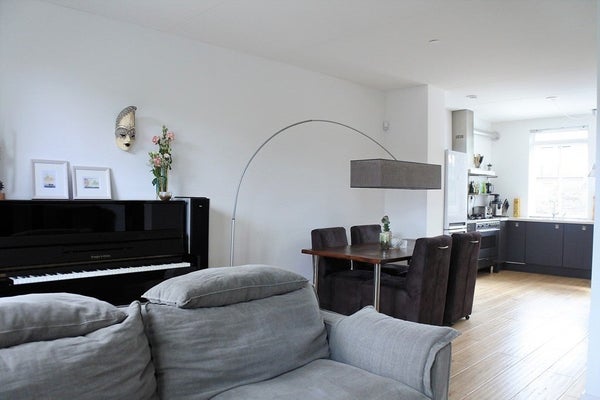 U komt binnen in de hal met het toilet, de meterkast, trap, trapkast en deur naar de woonkamer met open keuken. Op de vloer ligt een houten vloer, met daaronder vloerverwarming die zorgt voor warmte en comfort. De ramen lopen door van het plafond tot op de vloer. Hierdoor is er veel invallend licht. Heeft u even genoeg van het licht? De woning is gestoffeerd met hoogwaardige shutters welke ervoor zorgen dat er geen lichtinval meer is en u veel privacy heeft. De woonkamer heeft een open verbinding met de keuken. Die is modern, L-vormig opgesteld en van alle gemakken voorzien.