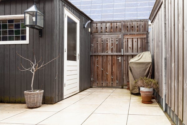 De lichtstraat in de uitbouw zorgt voor prachtig en bovendien veel licht in de woonkamer; via de schuifdeuren kom je in de gezellige tuin met schuur en achterom.