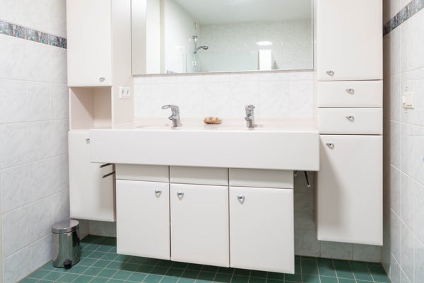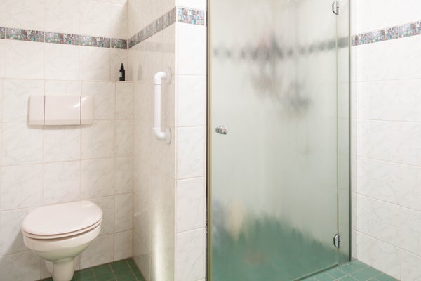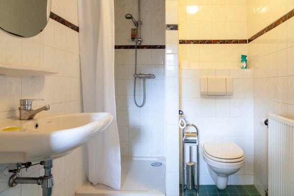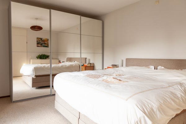 Via de woonkamer kom je in de zeer ruime slaapkamer en aangrenzende badkamer. De badkamer beschikt over een dubbele wastafel met zeer groot badkamermeubel, toilet en een douchecabine. Via de badkamer bereik je ook de bijkeuken met wasmachine en droger aansluiting, keukenblok met wasbak en toegang tot de tuin.