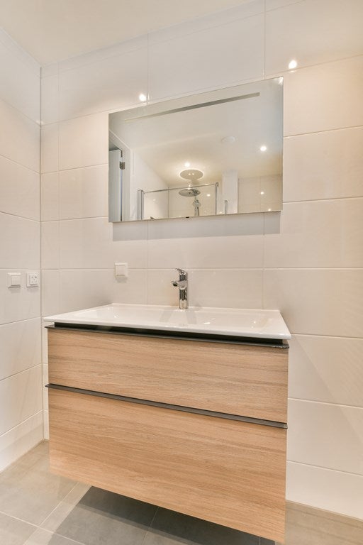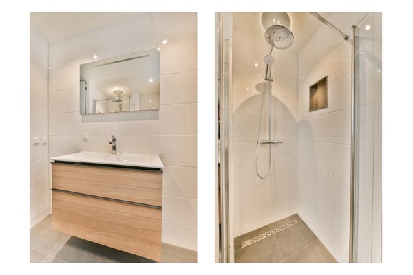 Op de eerste verdieping zijn drie slaapkamers, alle bereikbaar via de overloop. De kamers variëren in grootte en zijn geschikt als hoofd- en kinderkamers of als werkkamer. De overloop geeft ook toegang tot de badkamer. Deze is betegeld en voorzien van een inloopdouche met glazen wand, een wastafel met meubel, een zwevend toilet en een designradiator.