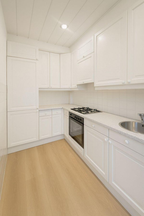 De keuken is vanuit zowel de hal als de woonkamer bereikbaar en is voorzien van diverse inbouwapparatuur, waaronder een koelkast met vriezer, vaatwasser en oven. Vanuit de keuken is de royale achtertuin bereikbaar.