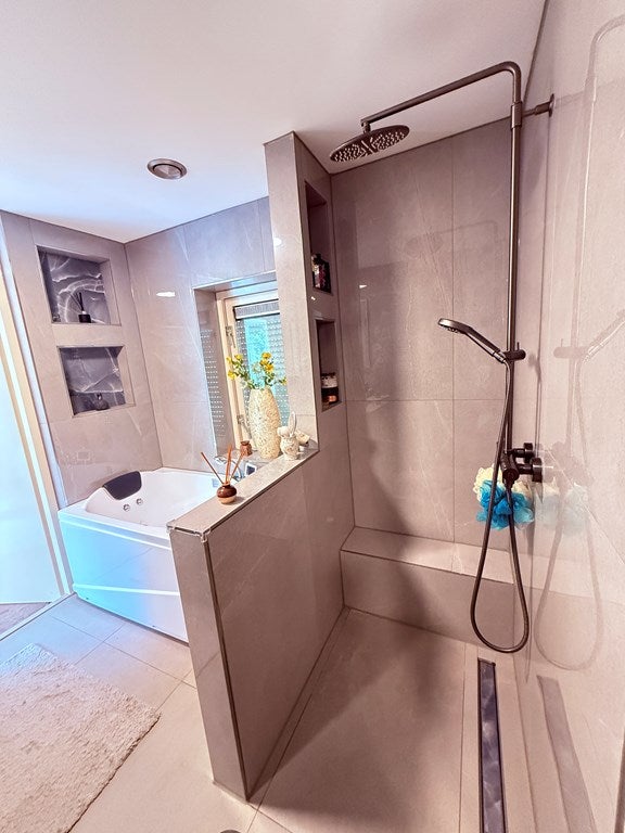 De eerste verdieping biedt drie slaapkamers, waaronder een luxe master suite met een privé balkon, inloopkast en ensuite badkamer met een inloopdouche, whirlpool bad, dubbele wastafel en aparte wc. Een andere grote slaapkamer is slim gecreëerd door twee kleinere kamers samen te voegen en heeft wand-tot-wand kasten.
