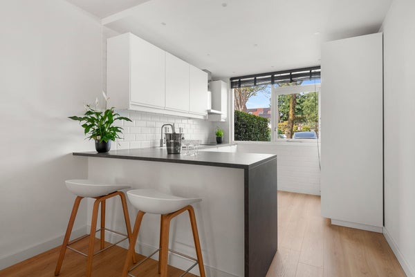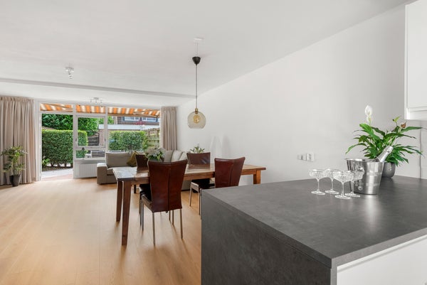 Via de voortuin bereikt u de entree met een modern toilet en de trap naar boven. Vervolgens komt u in de lichte woonkamer. Aan de voorzijde bevindt zich de moderne open keuken, uitgerust met een inductiekookplaat, vaatwasser, afzuigkap, grote koel- en vrieskast en een combi-oven met magnetron. De ruime woonkamer aan de achterzijde heeft grote ramen. De achtertuin van ca. 60 m² ligt op het zuidoosten en is via een achterom bereikbaar, ideaal voor kinderen om veilig te spelen of om te genieten van de zon. De ruimte is heerlijk licht en staat in direct contact met buiten.