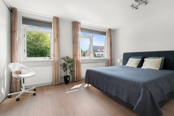 De bovenverdieping biedt verrassend veel ruimte dankzij de royale dwarskap. Op de overloop staan een Miele-wasmachine en -droger, en er is voldoende opslagruimte. Daarnaast zijn er twee grote kamers die gebruikt kunnen worden als slaapkamer, thuiskantoor, studeer- of hobbyruimte. Dankzij de prettige lichtinval is het een fijne plek om te werken of ontspannen.