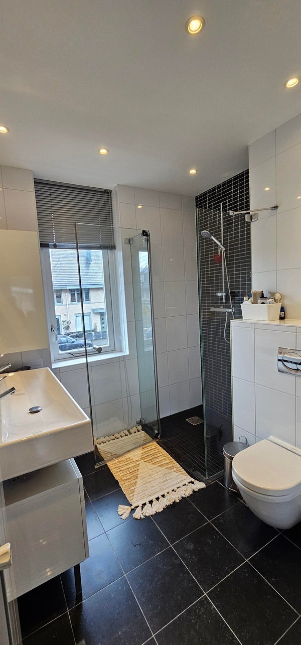 Eerste verdieping: Drie slaapkamers en een moderne badkamer met douchehoek, dubbele wastafel en tweede toilet.