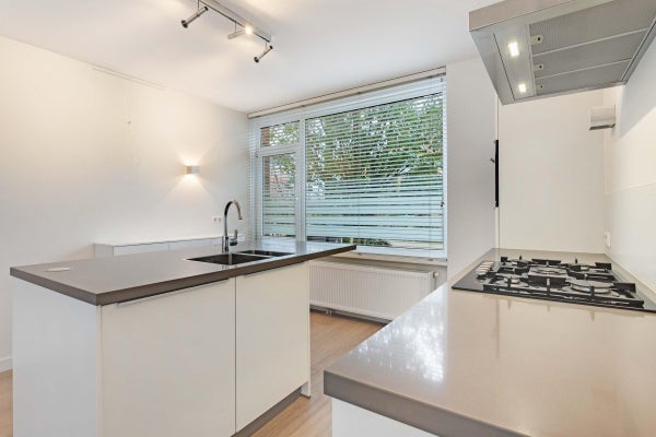Entree via de hal met toegang tot een separaat toilet. De ruime en lichte woonkamer biedt directe toegang tot de achtertuin. De moderne, halfopen keuken is voorzien van diverse inbouwapparatuur, waaronder een combi-oven, vaatwasser, gaskookplaat en afzuigkap.