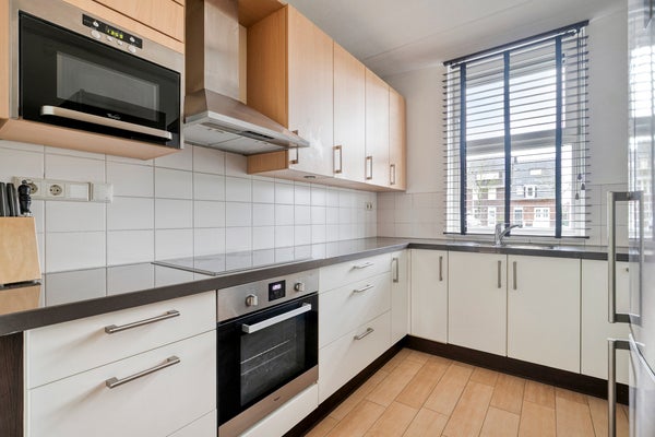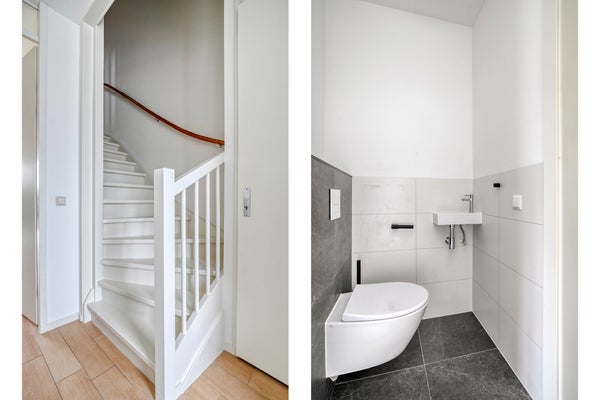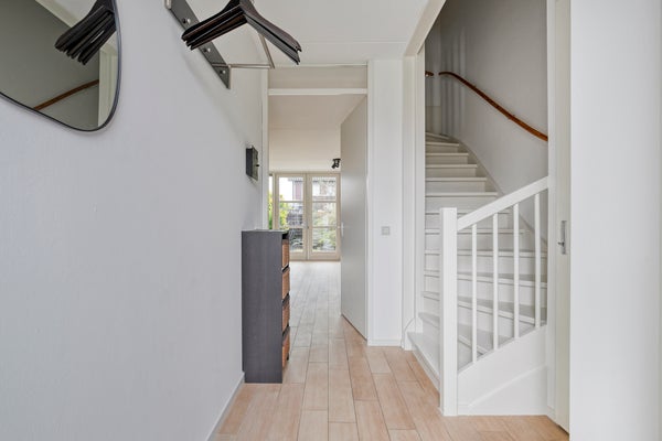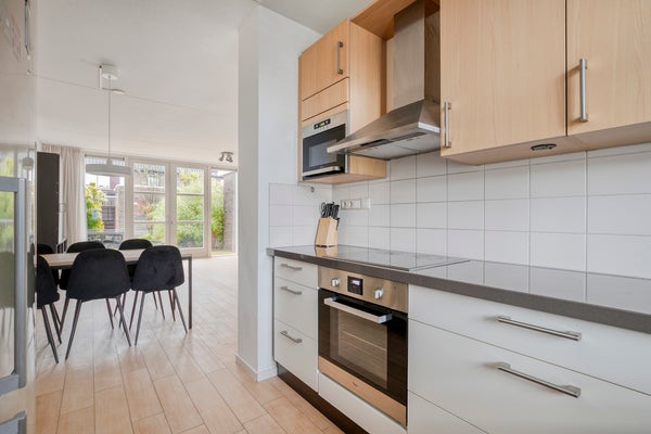 De grote entreehal biedt ruimte voor jassen en schoenen en geeft toegang tot het aparte toilet, de woonkamer en de trap naar de eerste verdieping. De woonkamer is zeer licht en ruim, met voldoende ruimte voor een comfortabele zithoek en een royale eettafel. Aan de achterkant openen dubbele deuren naar de mooie tuin, wat zorgt voor een fijne verbinding tussen binnen en buiten. De volledig uitgeruste open keuken is voorzien van de inbouwapparatuur die je nodig hebt, waaronder een vaatwasser, oven, magnetron, inductiekookplaat met vier pitten en veel opbergruimte. Het aparte toilet in de hal is vernieuwd en in moderne stijl afgewerkt.