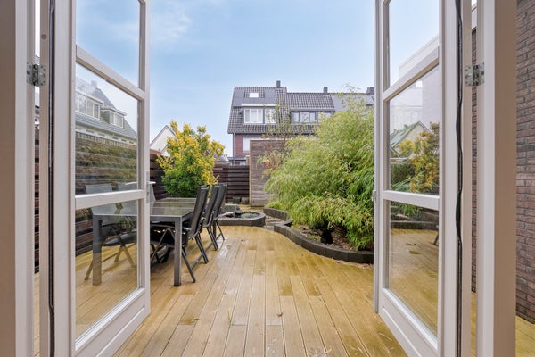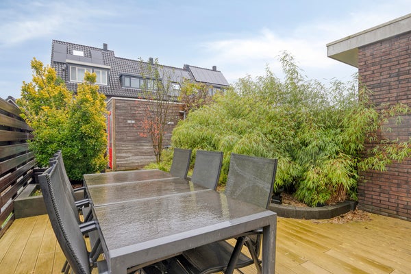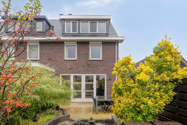 De zonnige achtertuin ligt op het zuidoosten en heeft een kindvriendelijke indeling. Er is voldoende ruimte voor zowel een loungeset als een buitenterras, en de tuin beschikt over een schuur voor fietsen en tuingereedschap.
