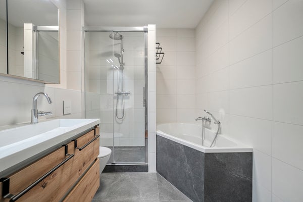 Op de eerste verdieping vind je twee comfortabele slaapkamers en een moderne badkamer. De badkamer is uitgerust met een douche, bad, toilet en dubbele wastafel, en is recent gerenoveerd, waardoor deze een frisse en moderne uitstraling heeft.
