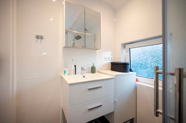 Hier bevinden zich drie slaapkamers en een moderne badkamer, volledig gerenoveerd en voorzien van een douche, toilet en wastafel met spiegel.