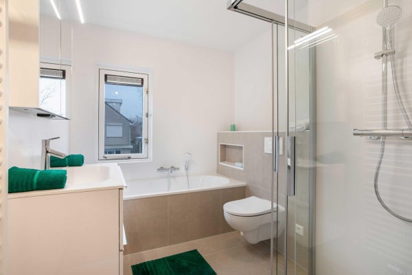 De van vloer tot plafond betegelde badkamer is zeer ruim en heeft een aparte douche, een groot bad, een wastafel en een toilet.