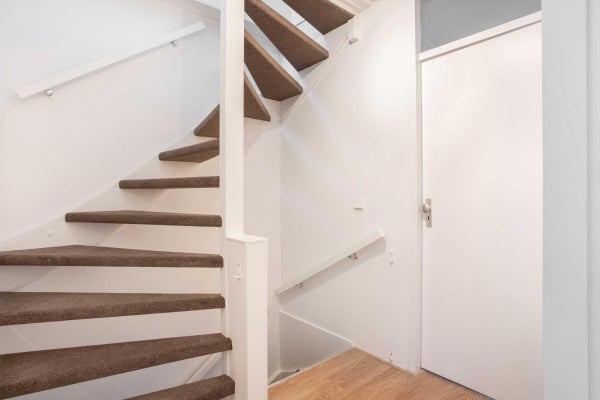 De hal is voorzien van een garderobe en een toilet met wastafel, een trap naar de eerste verdieping en een glazen paneeldeur die naar de woonkamer leidt.