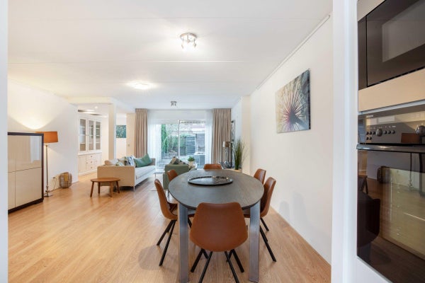 Vanuit de eetkamer openen openslaande deuren naar een zonnig terras en een 12 meter diepe, weelderige groene tuin op het westen, waardoor de buitenwereld naar binnen wordt gehaald en de toch al ruime woonkamer nog groter lijkt.