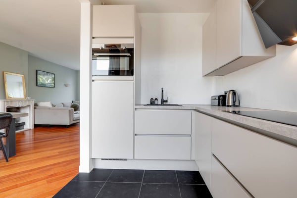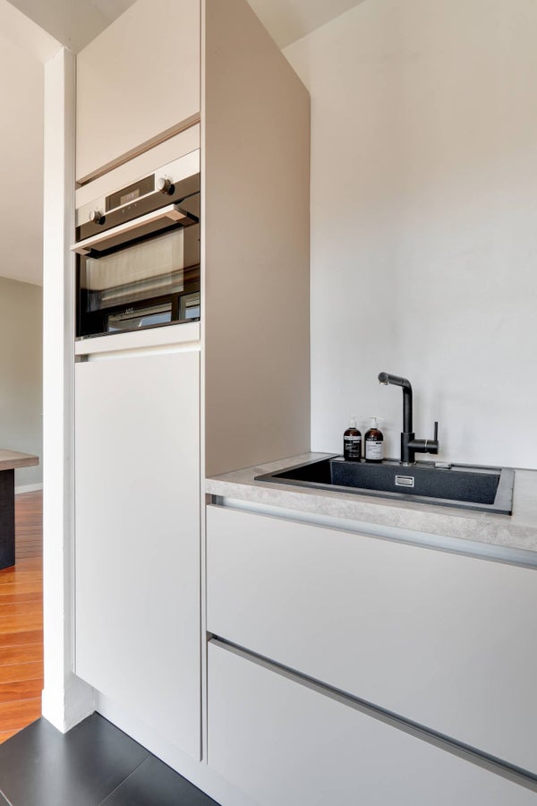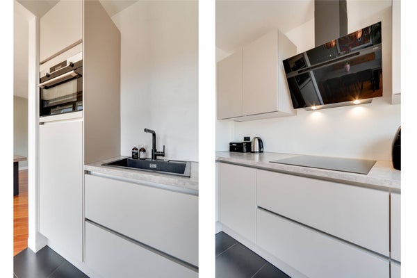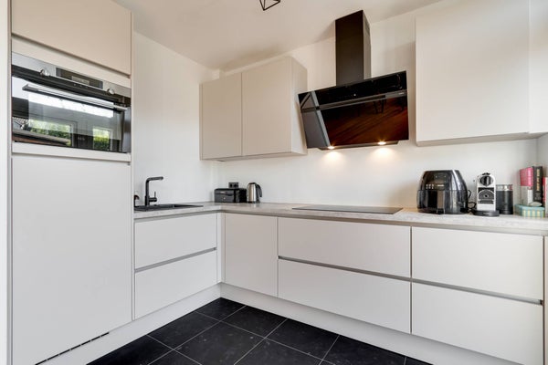 Via de entrée/gang met toilet is de woonkamer met open keuken toegankelijk. Vanuit de woonkamer is de zonnige tuin op het zuid-westen bereikbaar. De keuken is voorzien van alle gemakken, zoals een combi-oven, 4-pits inductieplaat, afzuigkap, koel-vriescombinatie en vaatwasser.