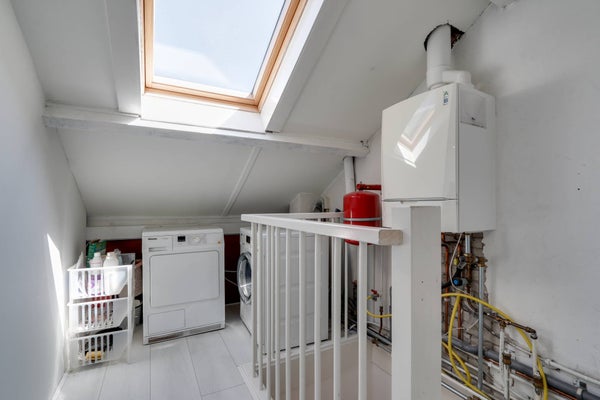 Op de tweede verdieping is de vierde slaapkamer met wastafel. Gesitueerd op de overloop bevindt zich de wasmachine/droger aansluiting.