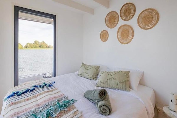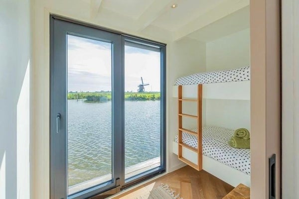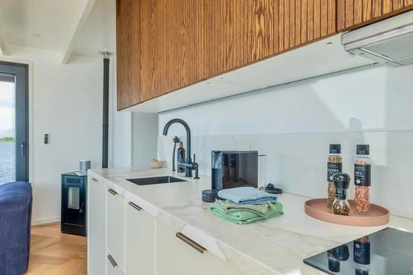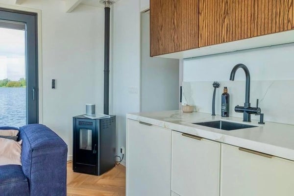 Grootte: Hij is 15 meter lang en 6 meter breed. De woonkamer en keuken zijn 25m2, en uitgerust met 3 grote schuifdeuren zodat je altijd een mooi uitzicht over het water hebt. De keuken is uitgerust met een oven, koelkast, vaatwasser, Nespresso-koffiemachine. De woonkamer heeft een comfortabele bank, een tv en een pelletkachel.