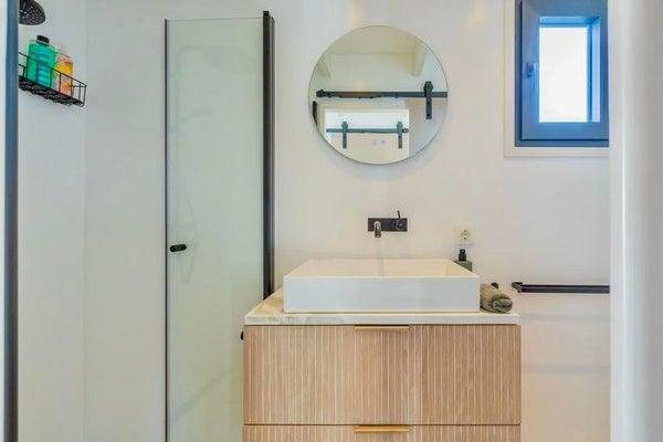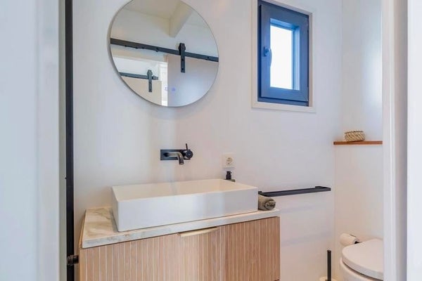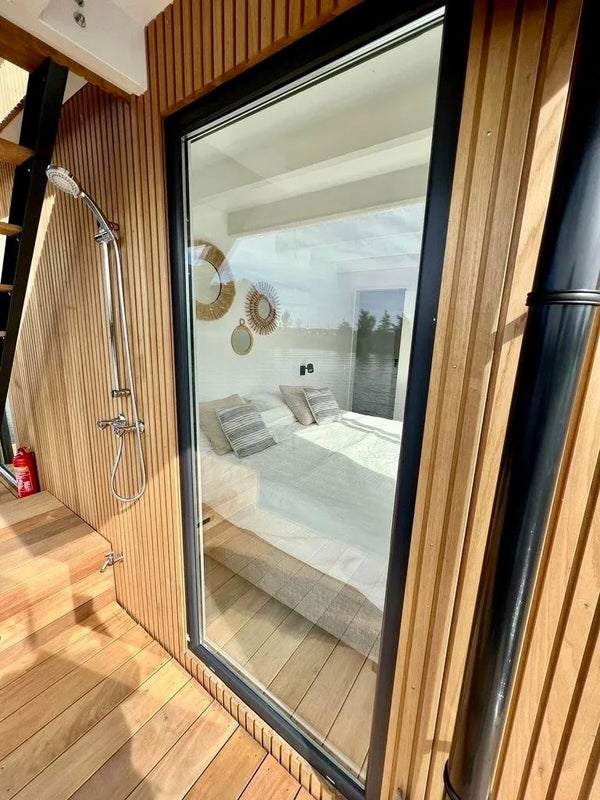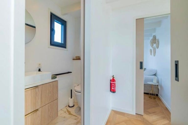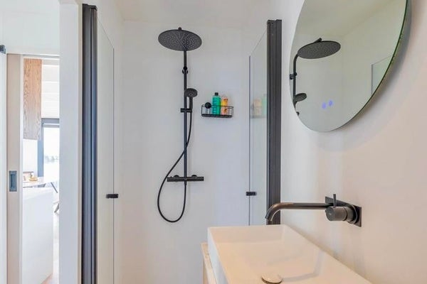 Er zijn ook grote schuifdeuren hier, zodat je in de ochtend vanaf de slaapkamer een duik kunt nemen. En daarna onder de warme buitendouche een mooie douche kunt nemen. Natuurlijk kun je ook binnen douchen. Er is een douche, wastafel en droogtoilet.