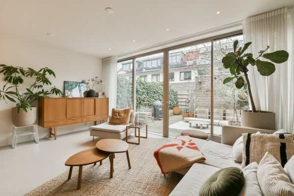 Vanuit de woonkamer kijk je uit op de ruime tuin.