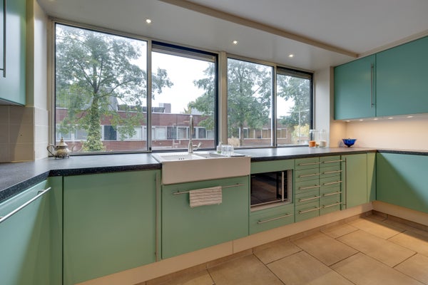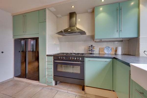 Een trap leidt naar de ruime woonkeuken, het hart van het huis. De keuken is voorzien van een dubbele koelkast, vaatwasser, magnetron, gasfornuis met oven en veel kastruimte. Dankzij de grote ramen aan beide kanten van de woonkeuken is de ruimte heerlijk licht, met uitzicht op zowel de tuin als de straatzijde.