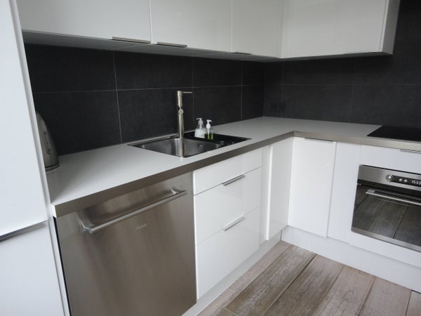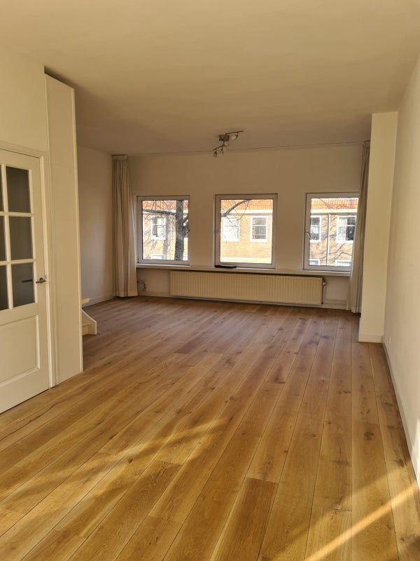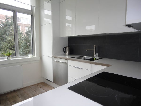 Ruime en lichte woonkamer met een grote raampartij over de volledige breedte aan de straatzijde. De halfopen keuken beschikt over een granieten aanrechtblad en is voorzien van diverse inbouwapparatuur, waaronder een vaatwasser, koel-/vriescombinatie en combi-oven.