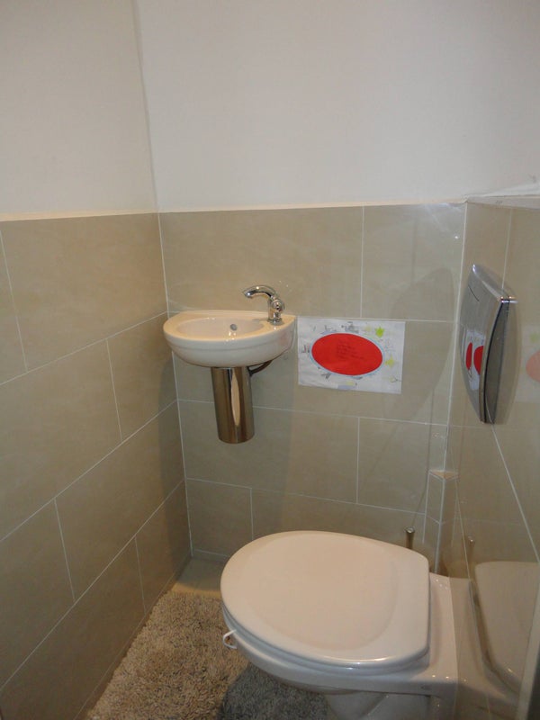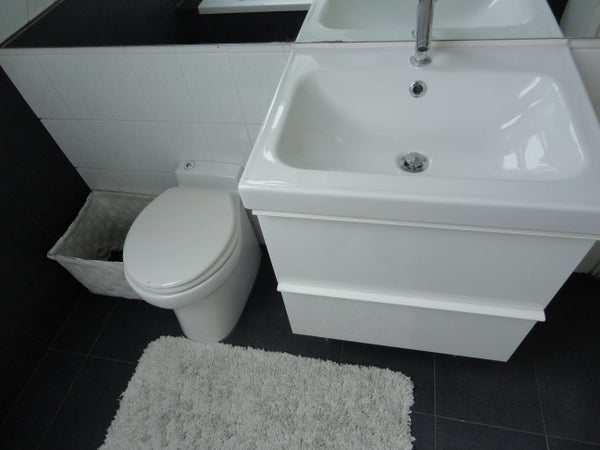 De badkamer beschikt over een ligbad met douche, wastafel, tweede toilet en aansluiting voor de wasmachine.