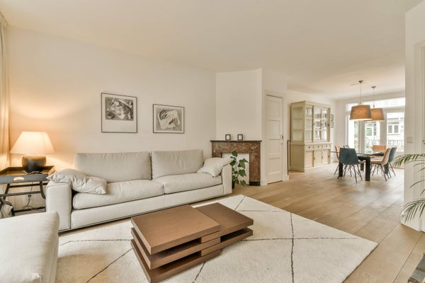 De ruime woonkamer bevindt zich op de eerste verdieping. Het heeft een mooie houten vloer, die naast de normale lichtinval de woonkamer erg aangenaam maakt. Aan de voorkant is er een gezellige zithoek met luxe nieuwe meubels. De ramen aan de straatzijde zorgen voor veel licht. Aan de achterkant is er een ruime eetkamer met half open keuken. Dit deel is zeer geschikt voor diners met vrienden en familie. De keuken is ruim en voorzien van moderne apparatuur. Het balkon aan de achterkant loopt langs de gehele gevel. Het hele huis is voorzien van dubbel glas.