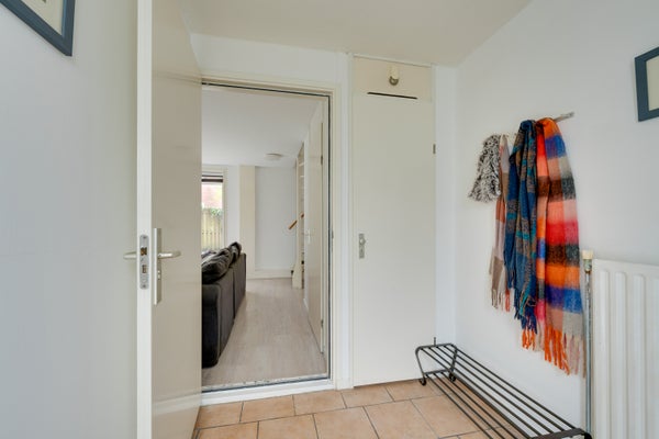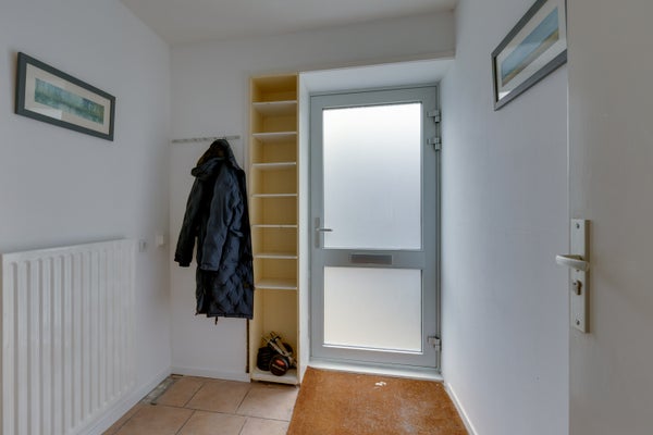 Je komt binnen in een royale hal met voldoende ruimte voor jassen, schoenen en zelfs een fiets. Vanuit de hal stap je de gezellige woonkamer binnen met schuifpui naar de ruime en zonnige tuin. De tuin beschikt over een berging die aan de woning vastzit, maar alleen van buitenaf bereikbaar is ideaal voor fietsen, tuingereedschap of extra opslag. Op deze verdieping bevindt zich tevens het eerste toilet.