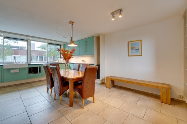 Een trap leidt naar de ruime woonkeuken, het hart van het huis. De keuken is voorzien van een dubbele koelkast, vaatwasser, magnetron, gasfornuis met oven en veel kastruimte. Dankzij de grote ramen aan beide kanten van de woonkeuken is de ruimte heerlijk licht, met uitzicht op zowel de tuin als de straatzijde.