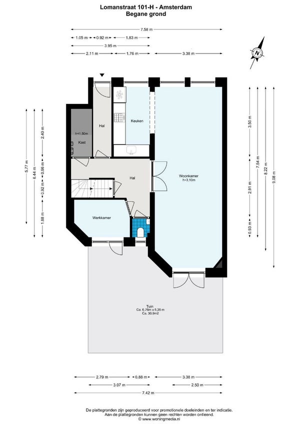 Entree, ruime hal en toegang tot de royale doorzonwoonkamer met veel daglicht. Aan de voorzijde bevindt zich de open keuken, voorzien van moderne inbouwapparatuur. Vanuit het woongedeelte aan de achterzijde zijn de openslaande deuren naar de zonnige tuin van circa 30 m², gelegen op het zuiden. Op deze verdieping bevindt zich tevens een aparte werkkamer. De kelder van circa 15 m² is toegankelijk vanuit de hal en biedt extra bergruimte.