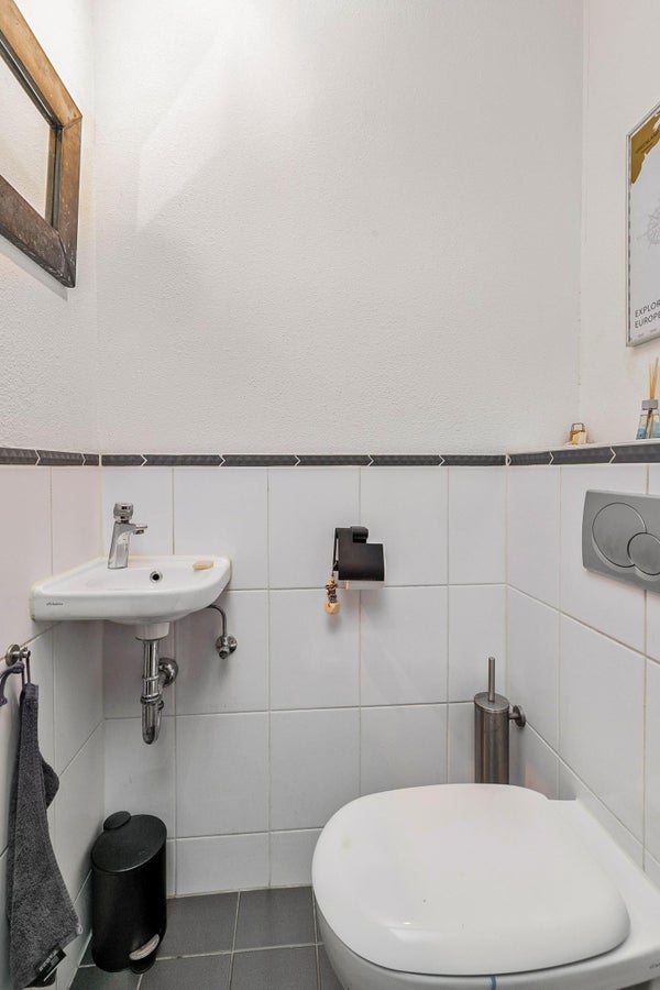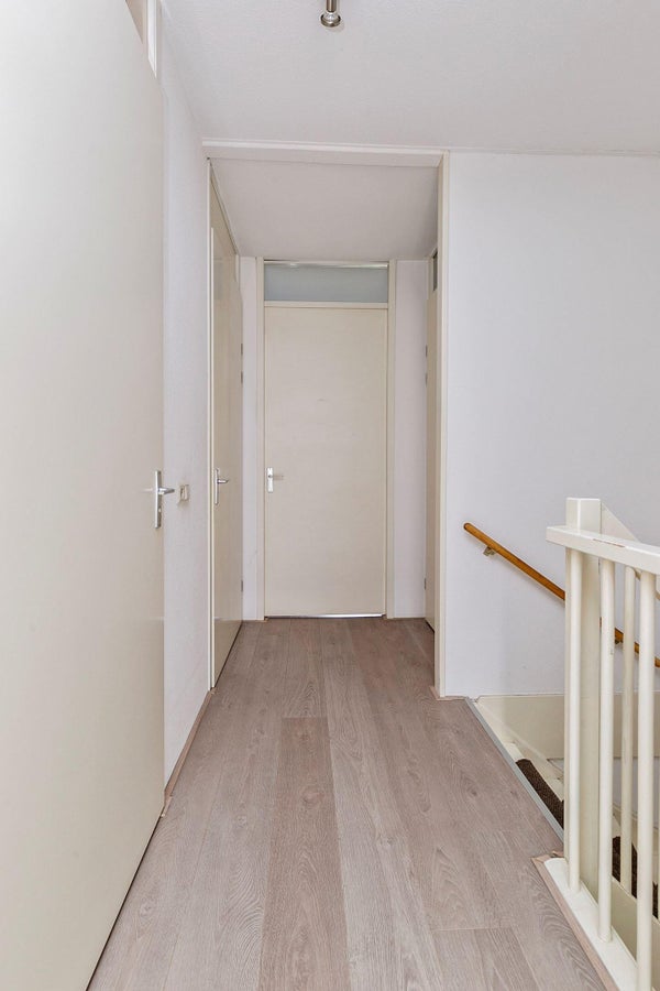 De volgende verdieping heeft een aparte wc, een badkamer en twee slaapkamers van goede grootte. Op de bovenste verdieping heb je een garderobe, een dakterras en een derde slaapkamer.
